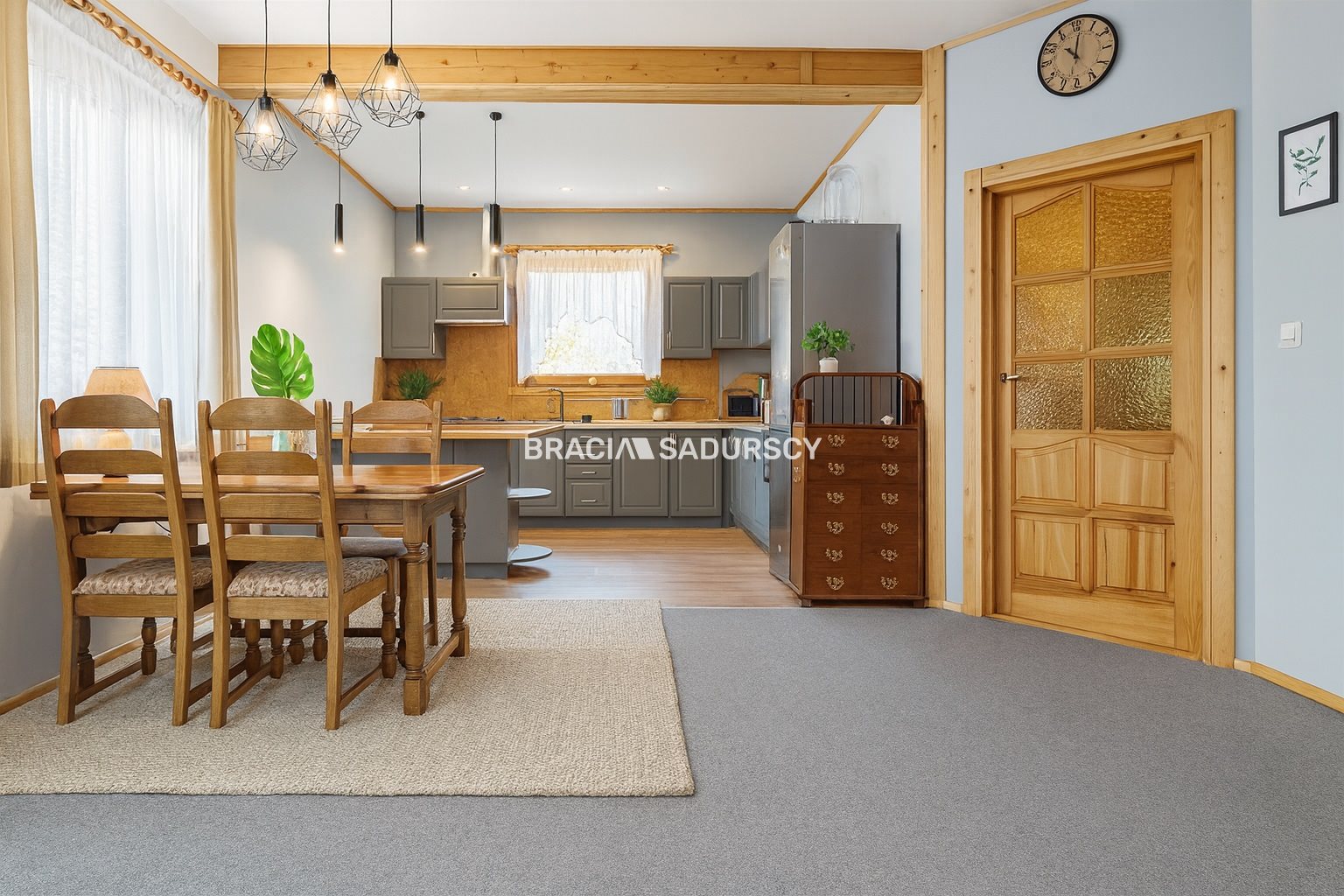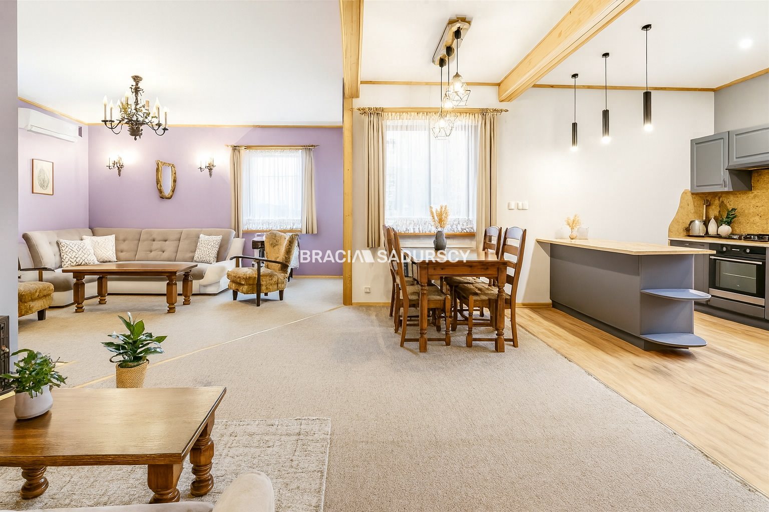 - salon połączony z kuchnią i jadalnią