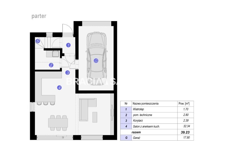 -Dom z garażem składa się z dwóch poziomów oraz poddasza dodatkowo dwóch miejsc postojowych zewnętrznych i ogródka.