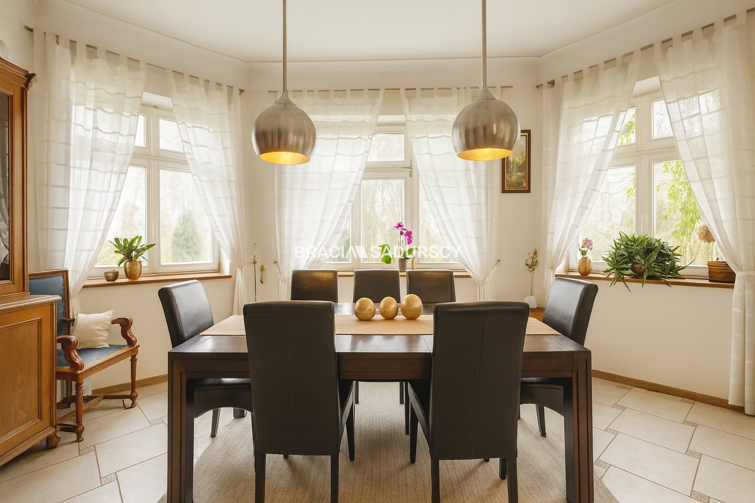 Ogród to prawdziwa perełka tej nieruchomości - zadbany przez ogrodnika, z duszą i klimatem. Znajdują się tu dwa ozdobne stawy z rybami, liczne zakątki wypoczynkowe, ogródek warzywny, skalniak, pergole, zadaszony taras z kominkiem oraz stylowe ogrodzenie z kutą bramą na pilota.
