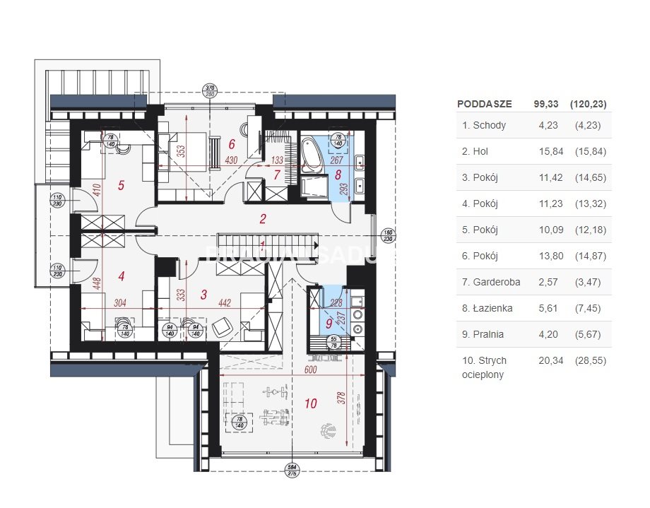 Na poddaszu znajdują się cztery sypialnie, garderoba, pralnia, łazienka oraz nieocieplony strych.
