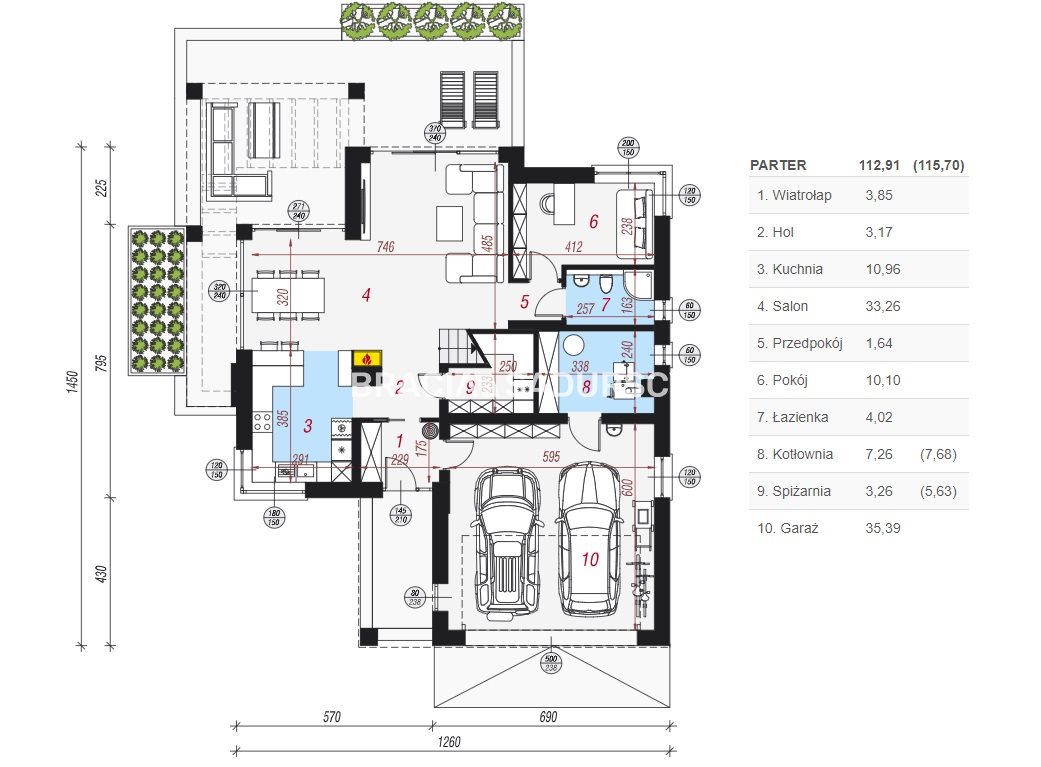 Parter składa się z salonu połączonego z aneksem kuchennym, wiatrołapu, łazienki, spiżarni, pokoju, kotłowni oraz dwustanowiskowego garażu.