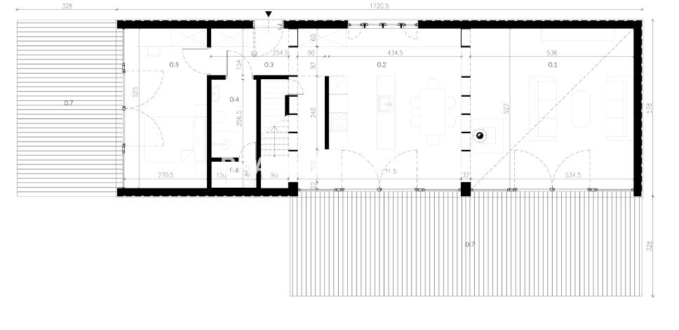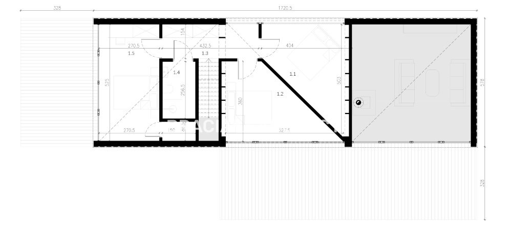 Posadowiony jest na 9-ciu betonowych kolumnach fundamentowych. W środku to 35 m2 powierzchni użytkowej w której pod jednym dachem udało się zaprojektować; salon, kuchnie jadalnie, łazienkę i sypialnie na antresoli z widokiem. Cały dom został wykonany w technologii drewnianej z wewnętrznym ociepleniem, co sprawia, że dom można użytkować przez cały rok.