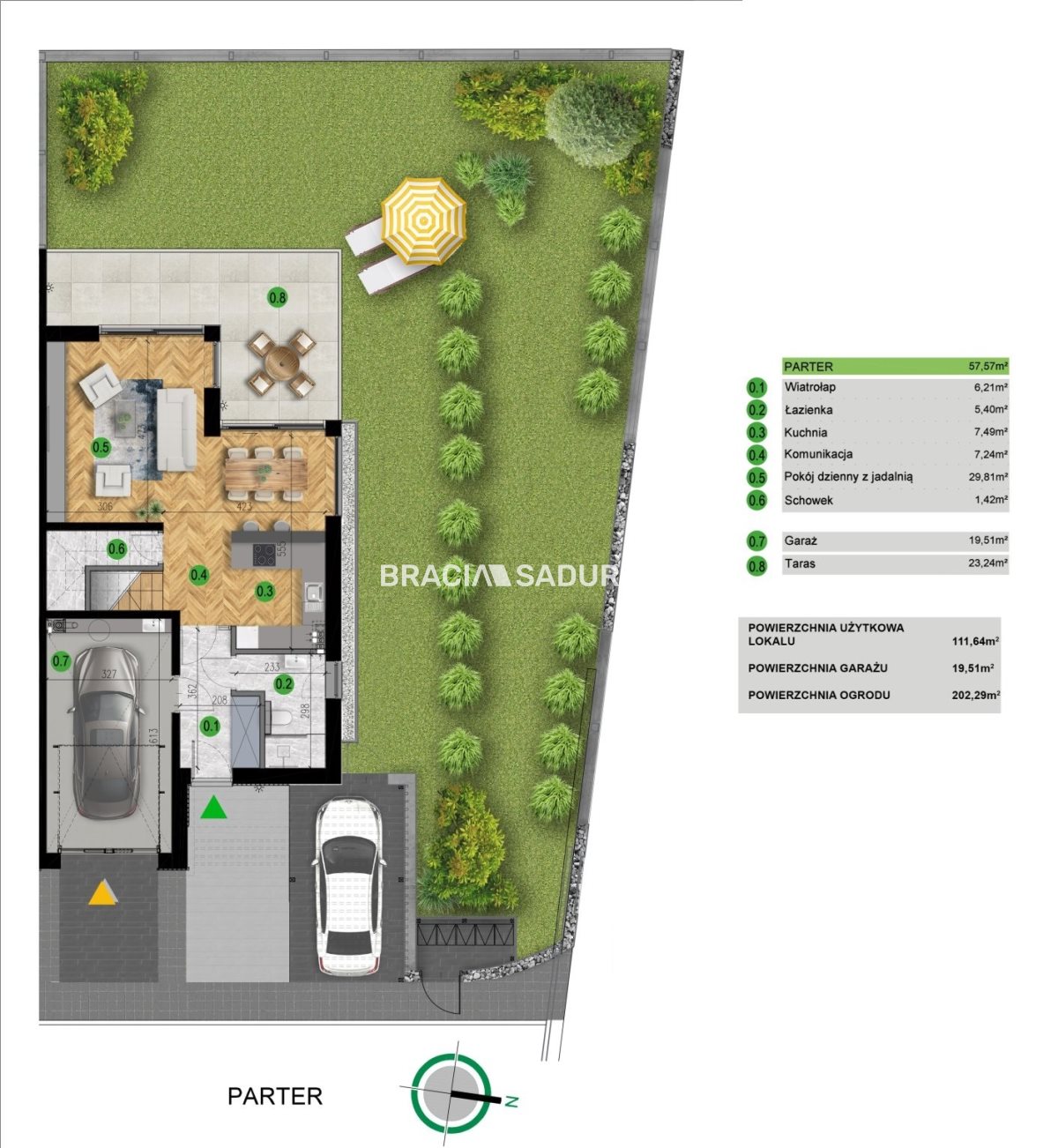 Każdy dom posiada dwie główne kondygnacje, parter z przestronnym tarasem i ogródkiem, piętro, garaż i dwa miejsca postojowe oraz wspaniałe sielankowe widoki, dodatkowo strych do własnej adaptacji.