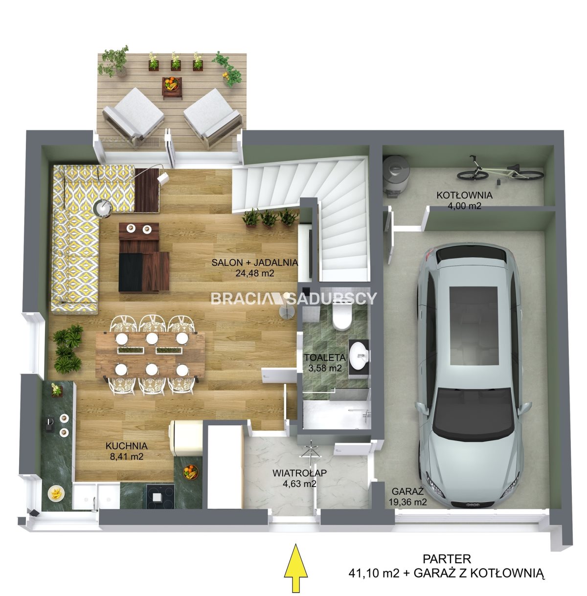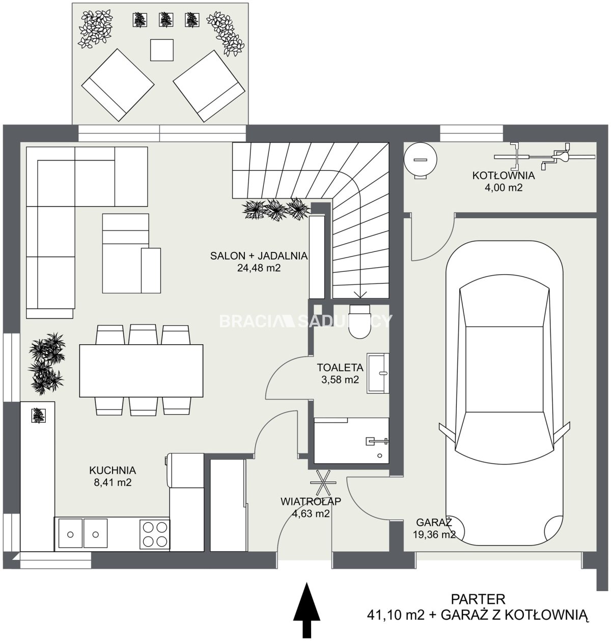 PARTER: salon połączony z jadalnią, aneks kuchenny, toaleta, wiatrołap, kotłowania i garaż.