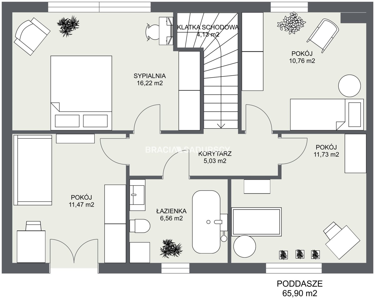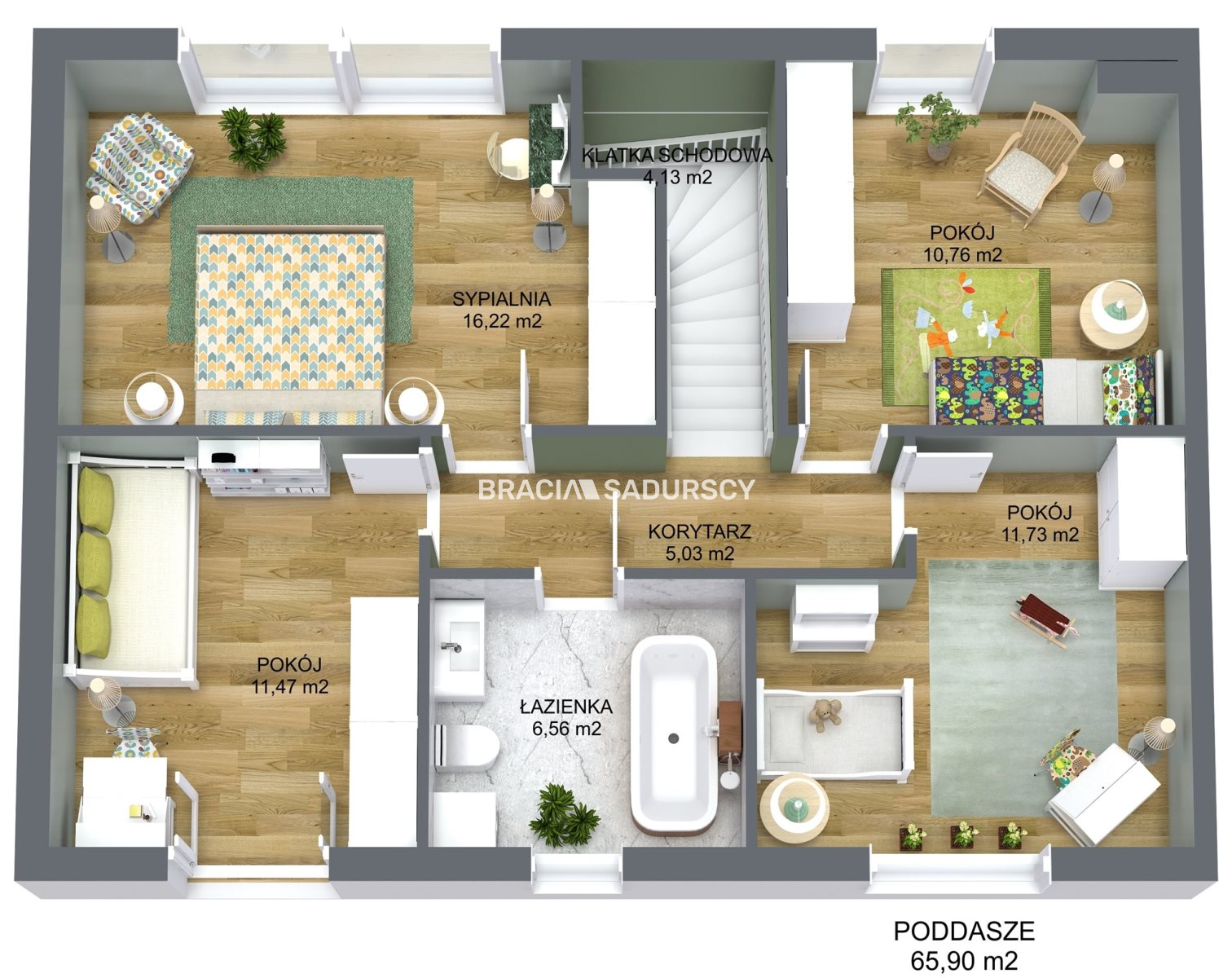 PODDASZE: jedna główna sypialnia (ok 16 m2), trzy mniejsze pokoje i łazienka.