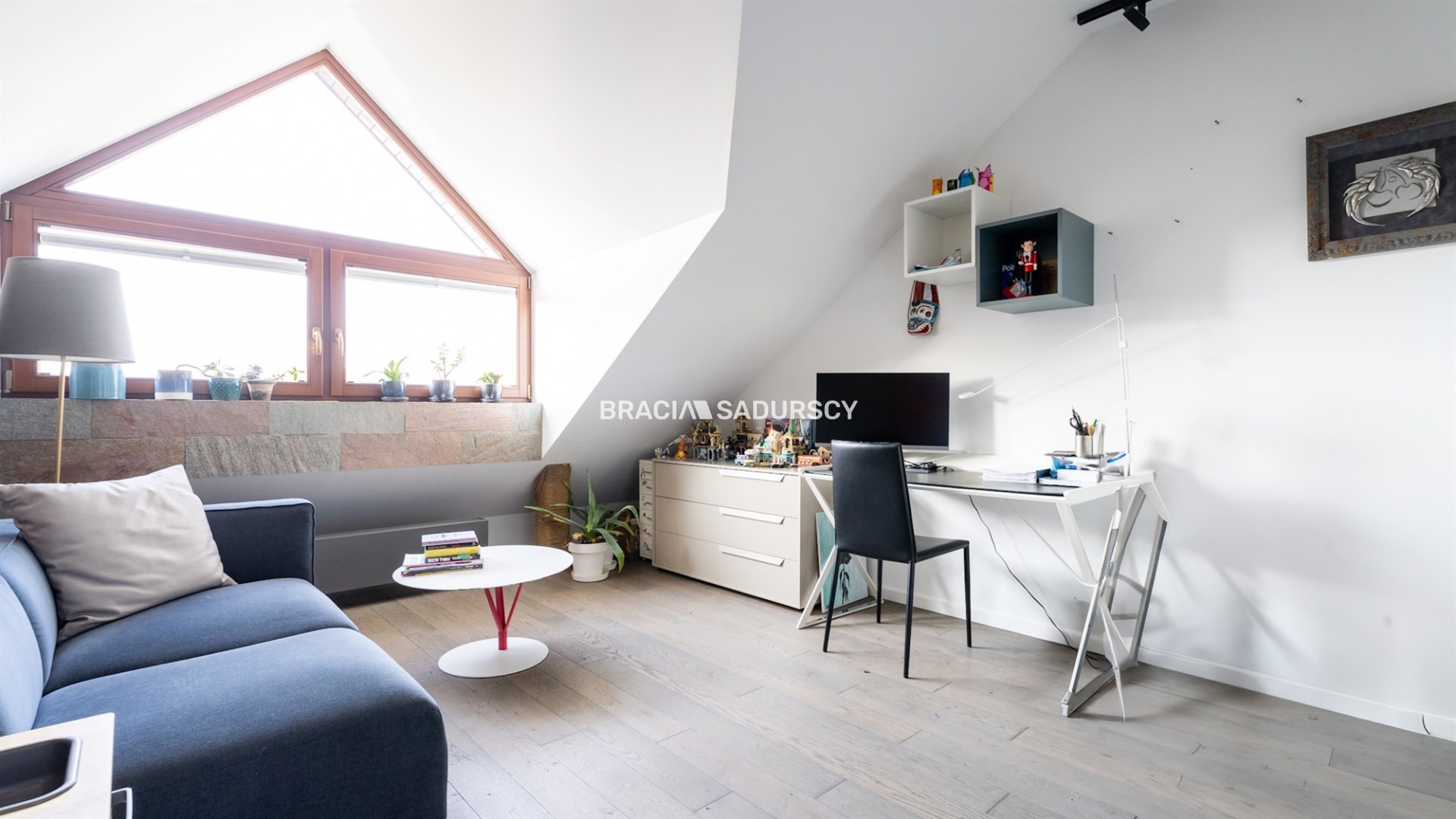 Na pierwszym piętrze znajduje się duża łazienka z oknem z wanną i prysznicem, dwie sypialnie dla dzieci oraz jedna większa sypialnia z wydzieloną garderobą typu walk in.