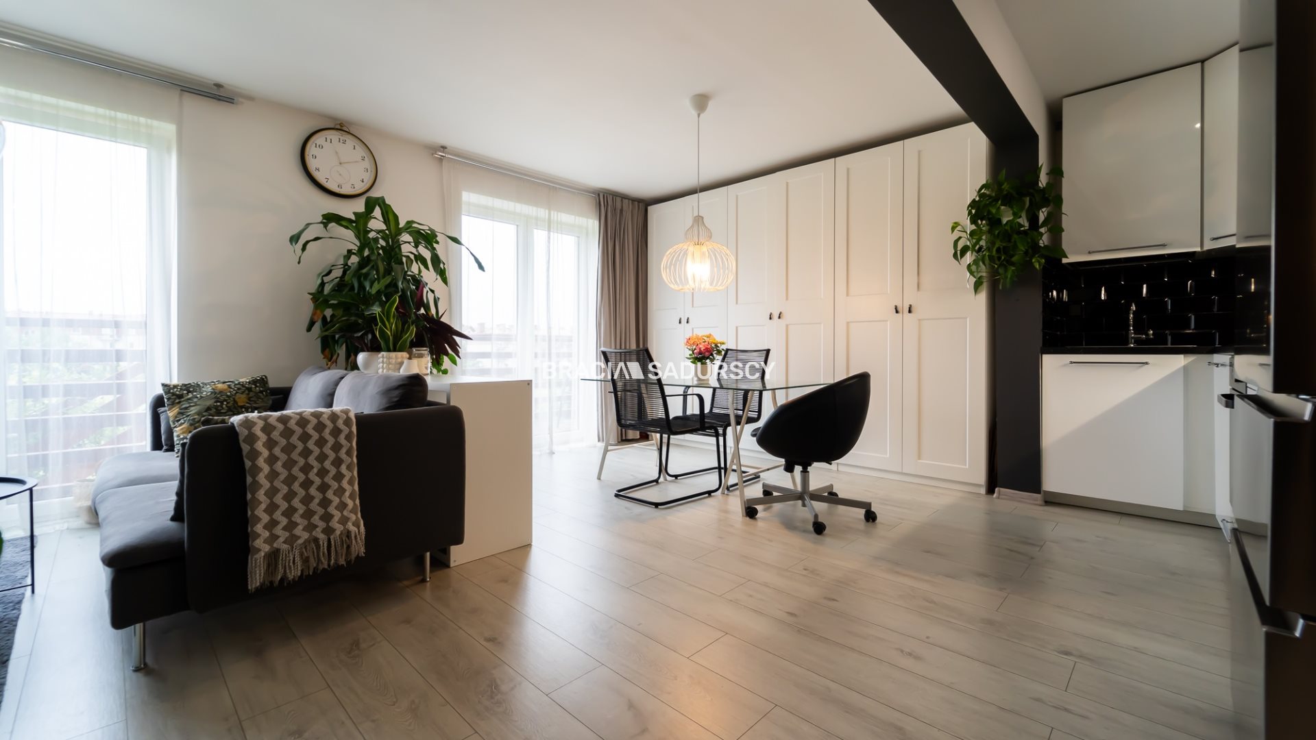 środkowy poziom zajmuje otwarta przestrzeń przedpokoju, salonu i jadalni połączonych z aneksem kuchennym . Znajduje się tu również dodatkowy pokój , który może pełnić funkcję sypialni lub gabinetu oraz łazienka z prysznicem