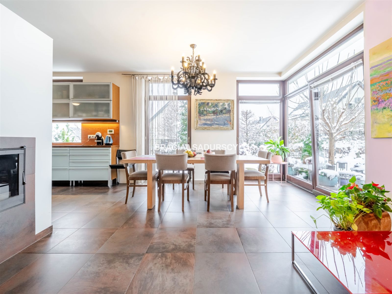 duży, jasny salon z dużymi przeszkleniami,