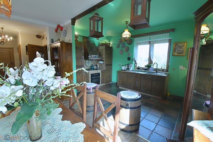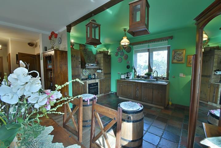 Residential building built in 2011. The house was finished to a high standard, very tasteful and functional. The house has modern solutions, yet the decor itself is immeasurably atmospheric. A set living room with a western exposure and a fireplace. The kitchen is fully equipped, with top-of-the-line equipment - fridge, oven, gas hob, dishwasher 60 cm, hood. Oak furniture of extraordinary beauty made by a carpenter, made to measure, according to an individual, very original design. Beautiful fittings amaze with their original, sublime form. Two bathrooms - one with a free-standing bathtub, with the possibility of connecting a bidet, and the other upstairs with a shower connection. The upper bathroom is yet to be finished, i.e. to be painted and fixtures installed. It is clad with stylish handmade tiles. On the floors are high-grade panels. Wooden staircase. Underfloor heating in the kitchen and bathrooms. Spaciousness and freedom of movement. Garage in the body of the building.