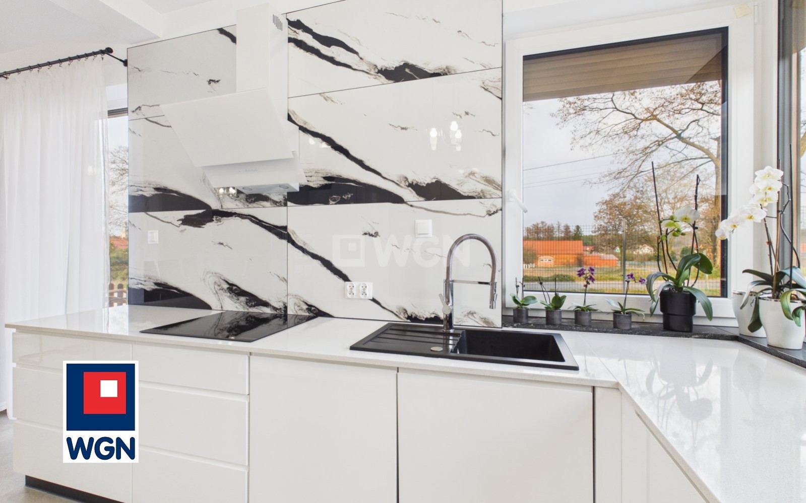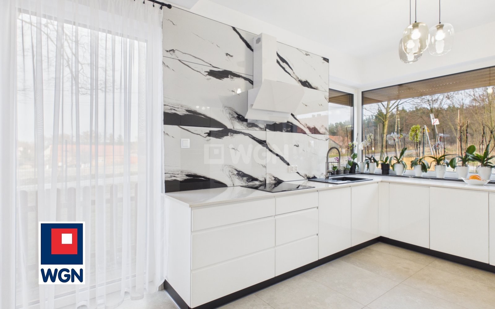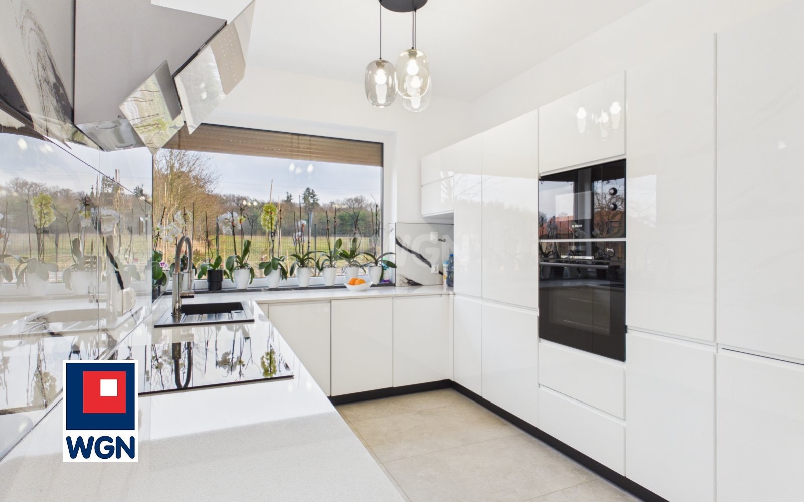 Dom urządzony z dbałością o każdy szczegół. W kuchni zabudowa kuchenna z dużym blatem roboczym z konglomeratu kwarcowego wraz ze sprzętem AGD.