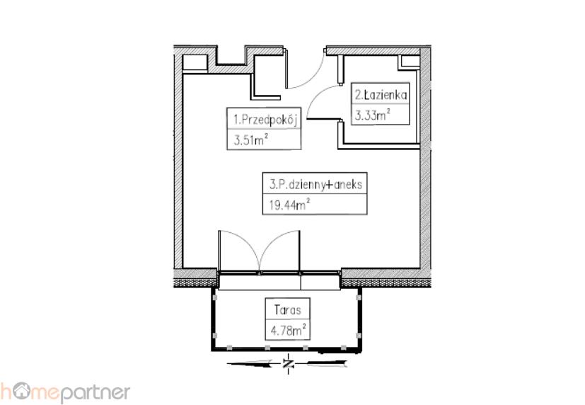 - Salon z aneksem kuchennym (ok. 20 m) z możliwością wydzielenia przestrzeni sypialnianej, jasny, z dużymi oknami i wyjściem na balkon