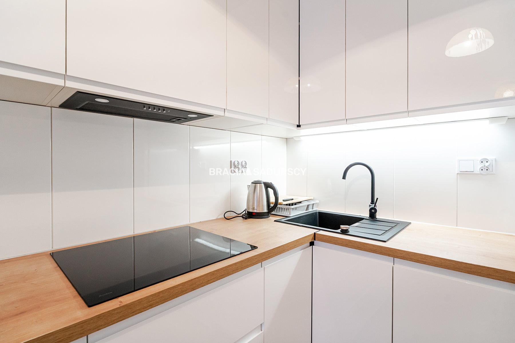 Kuchnia wyposażona w meble na wymiar oraz sprzęt AGD.