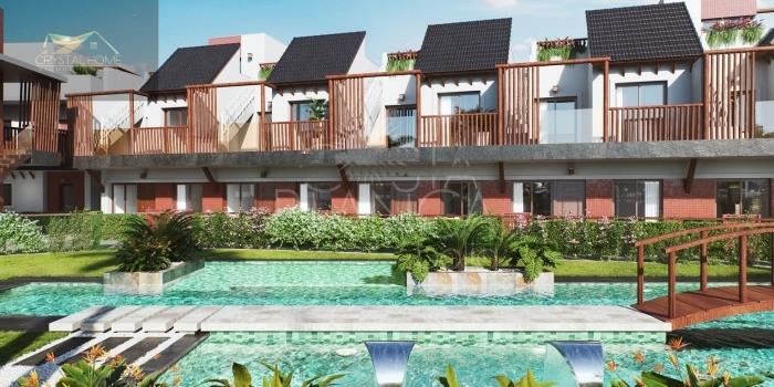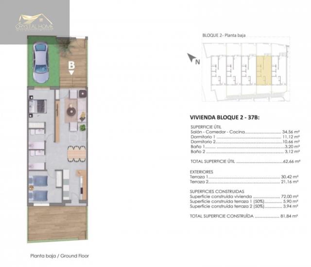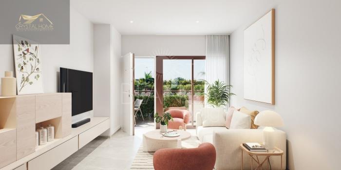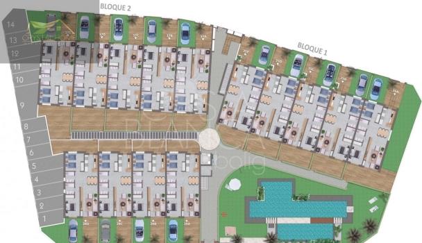 Nowy budynek mieszkalny z 28 bungalowów z 2 sypialniami, 2 łazienki na parterze z prywatnym ogrodem i 2 i 3 sypialnie i 2 i 3 łazienki na najwyższym piętrze z prywatnym tarasem.