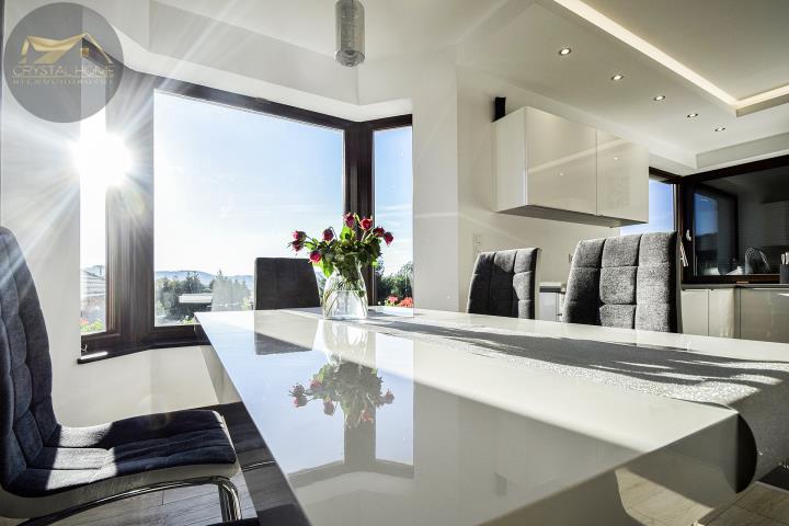 To tutaj znajduje się wyjątkowy doświetlony, przestronny salon, harmonijnie połączony z kuchnią i spiżarnią. A wszystko otoczone pięknymi widokami. Dla kino-maniaków projektor i chowany w suficie 3m ekran.