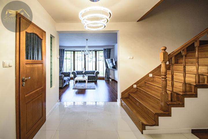 Na podłogach znajdują się eleganckie panele oraz płytki, a drewniane schody dodają wnętrzu ciepła i klasy.