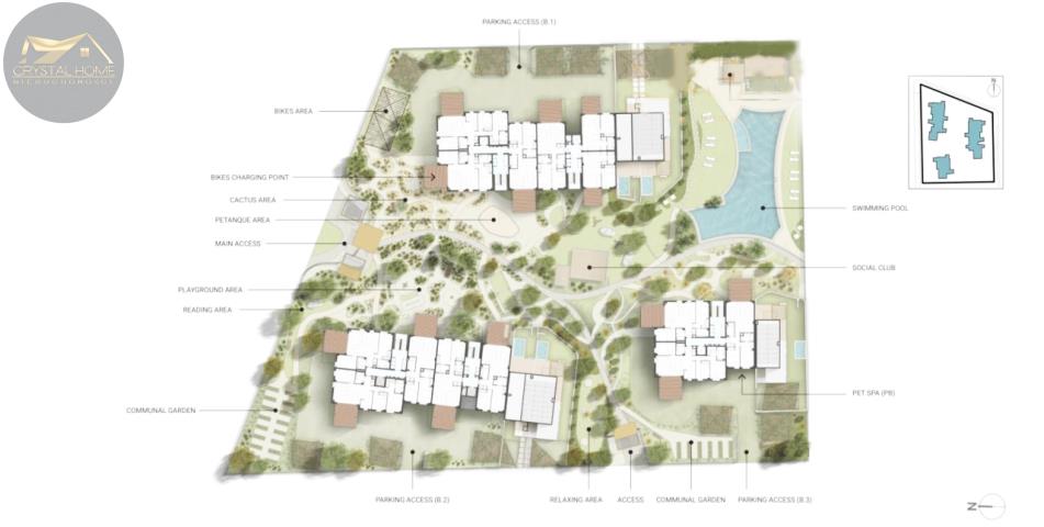 Części wspólne tego wyjątkowego obiektu mieszkalnego z pewnością są synonimem luksusowego życia w otoczeniu natury. Spacerując po różnych obszarach, znajdziesz idealne miejsca na piknik, uprawianie sportu, a przede wszystkim korzystanie z rowerów. Spotkaj się ze swoim partnerem, rodziną lub przyjaciółmi w klubach towarzyskich; ciesz się otwartymi placami chronionymi przed słońcem i zrelaksuj się w chłodnych miejscach, gdzie kwitnie piękna, lokalna roślinność.