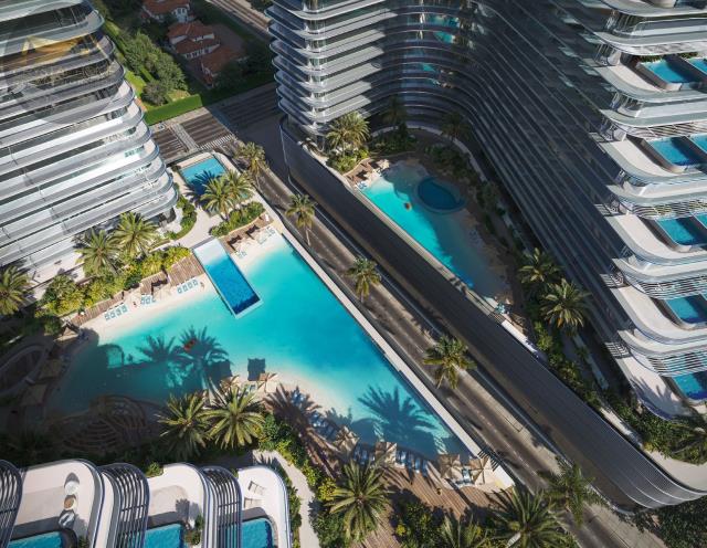siłownia, Basen z plażą i basen dla dzieci, Prywatne baseny w apartamentach Sky Terrace, Padel i boisko do koszykówki 3x3, Tor do biegania, Plac zabaw dla dzieci itp.