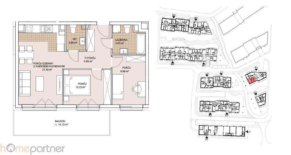Do mieszkania przynależy duży balkon o powierzchni 14,10 m2