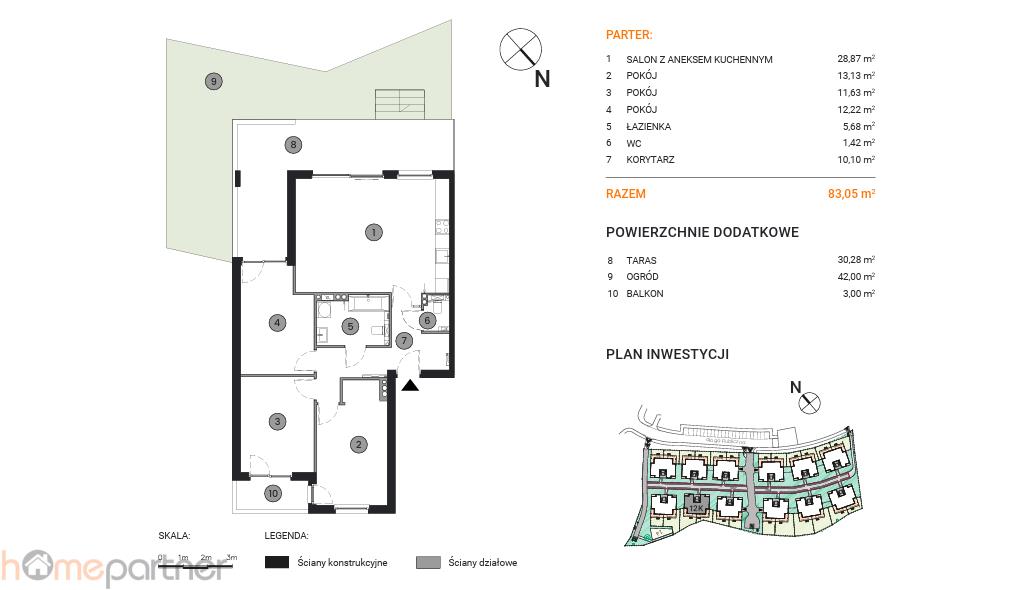 Do mieszkania przynależy ogródek (42m2) z tarasem (30,28m2) oraz balkon (3m2).