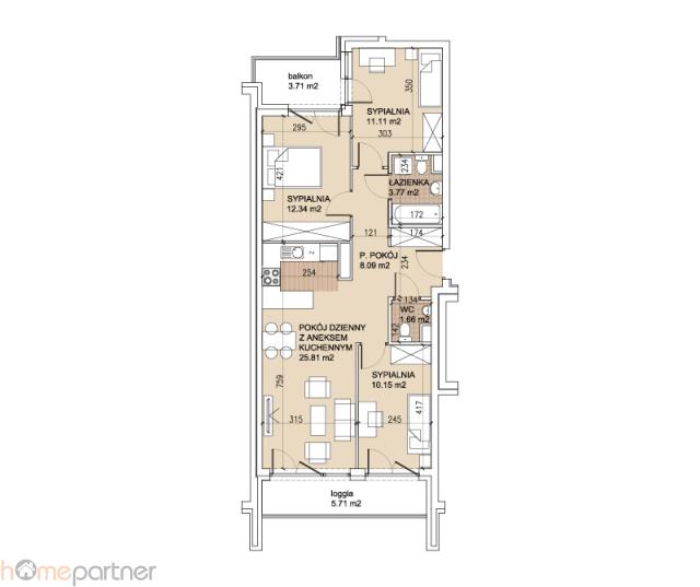 Do mieszkania przynależą dwa balkony o powierzchniach 5,71 m2 oraz 3,71 m2.