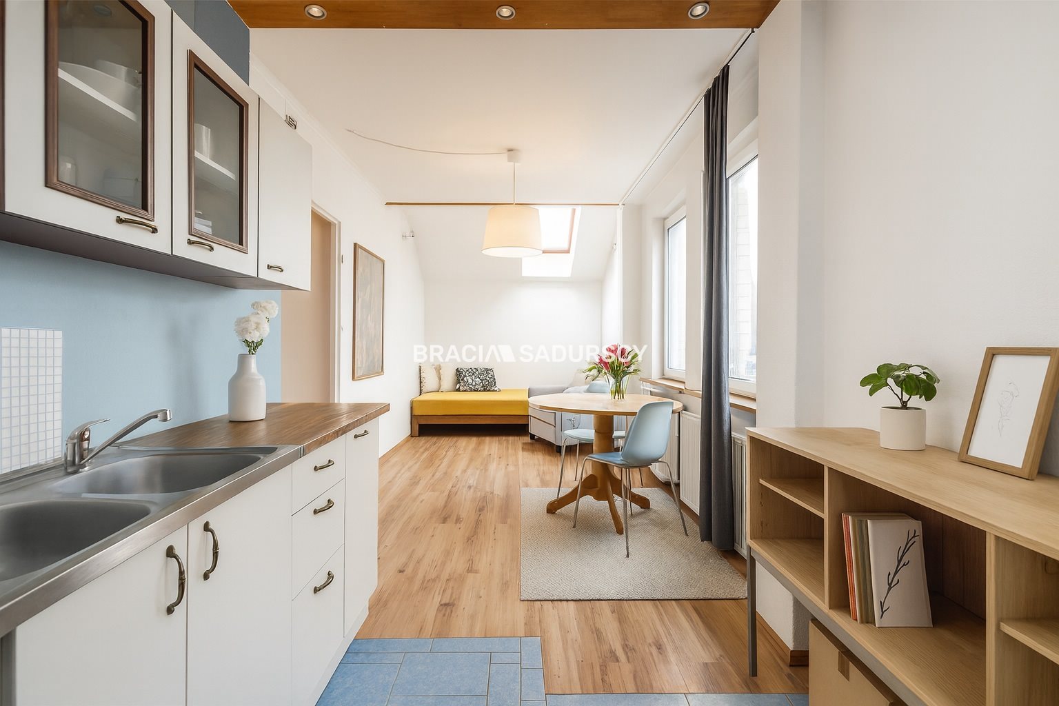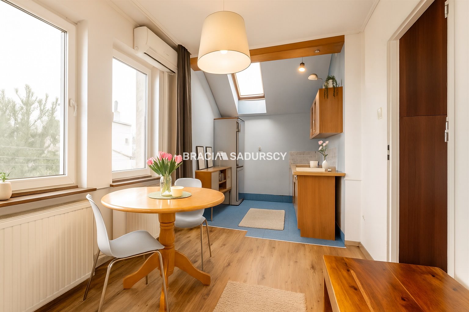 Z okien salonu rozpościera się piękny widok na dachy pobliskich budynków i drzewa, a wnikliwe oko przy dobrej pogodzie dostrzeże nawet Kopiec Kościuszki. Ustawny salon połączony z jadalnią i kuchnią stanie się sercem domu, w którym chętnie odpoczniemy w gronie rodziny czy przyjaciół.