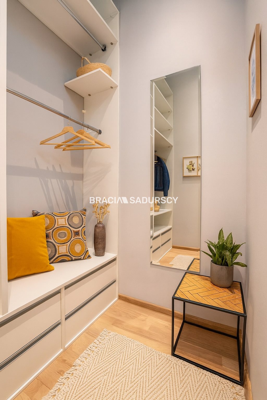 Kuchnia odrębna z oknem, w pełni wyposażona w zmywarkę, piekarnik, lodówkę, płytę indukcyjną oraz pralkę. W mieszkaniu znajdują się również meble, w tym zabudowy wykonane na wymiar: kuchnia, garderoba, antresola oraz przedpokój.