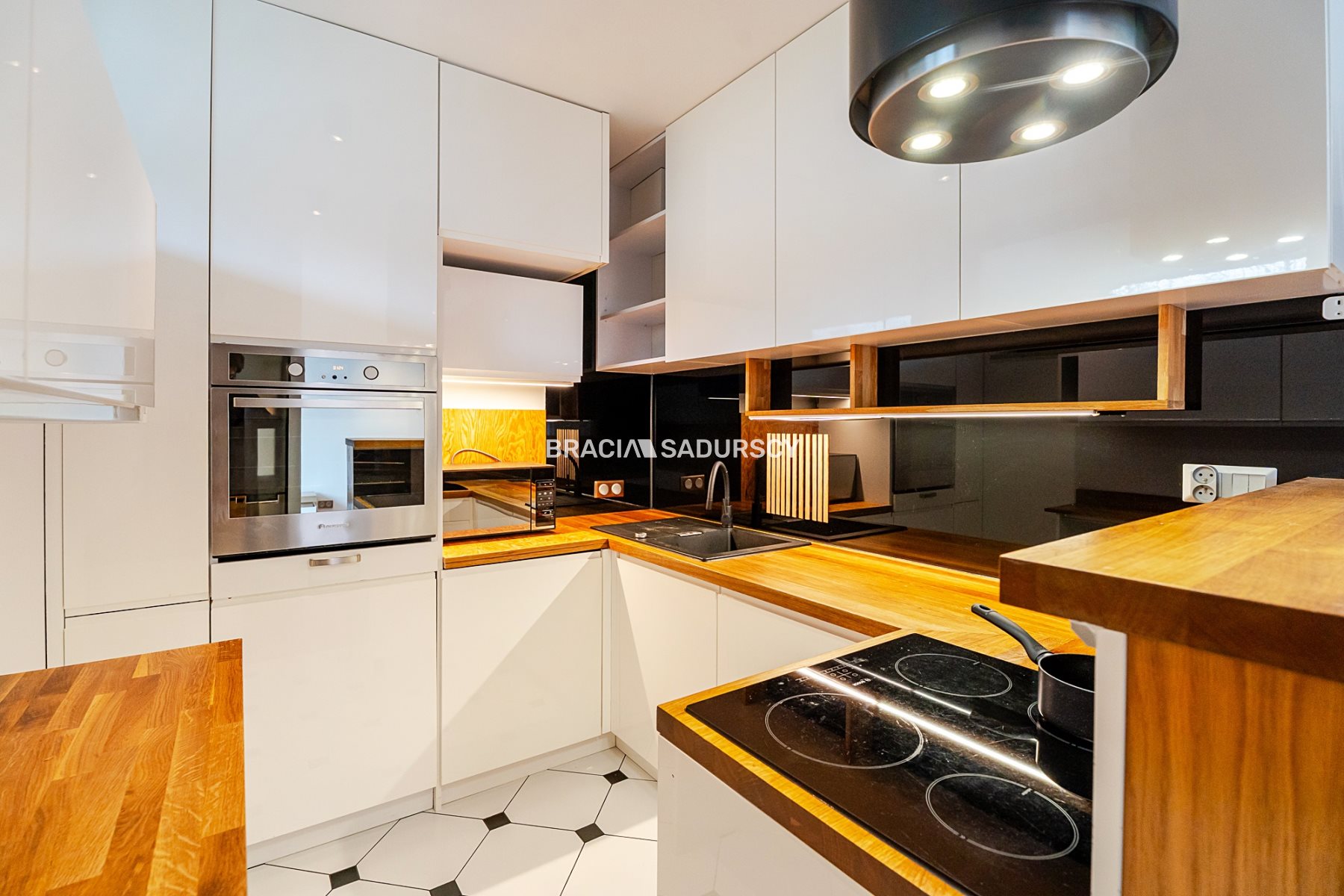- a fully equipped kitchenette (kitchen): wooden countertops, refrigerator, dishwasher, oven, induction hob, and microwave