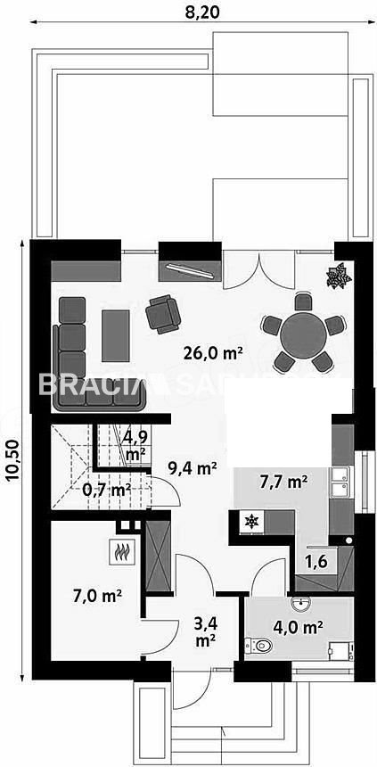 Parter składa się z pokoju dziennego z jadalnią 26m2, kuchni 7,7m2, łazienki 4m2, wiatrołapu 3,4m2, korytarza 9,4m2, kotłowni 7m2, klatki schodowej 4,9m2 i schowka 1m2.