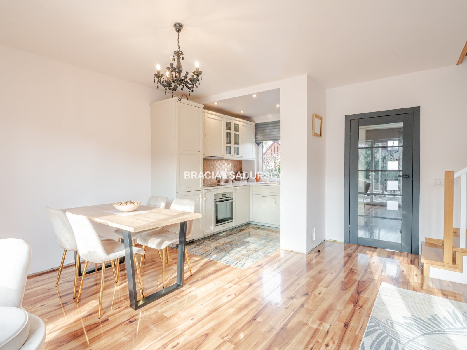 - w pokojach panele laminowane na wysoki połysk, w kuchni, przedpokoju i łazience płytki