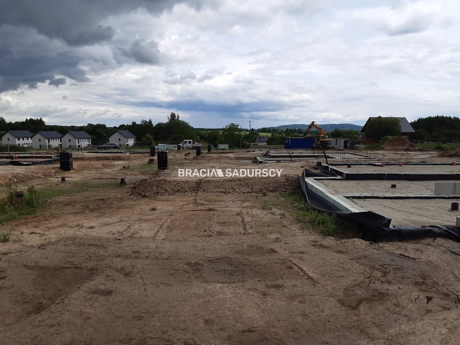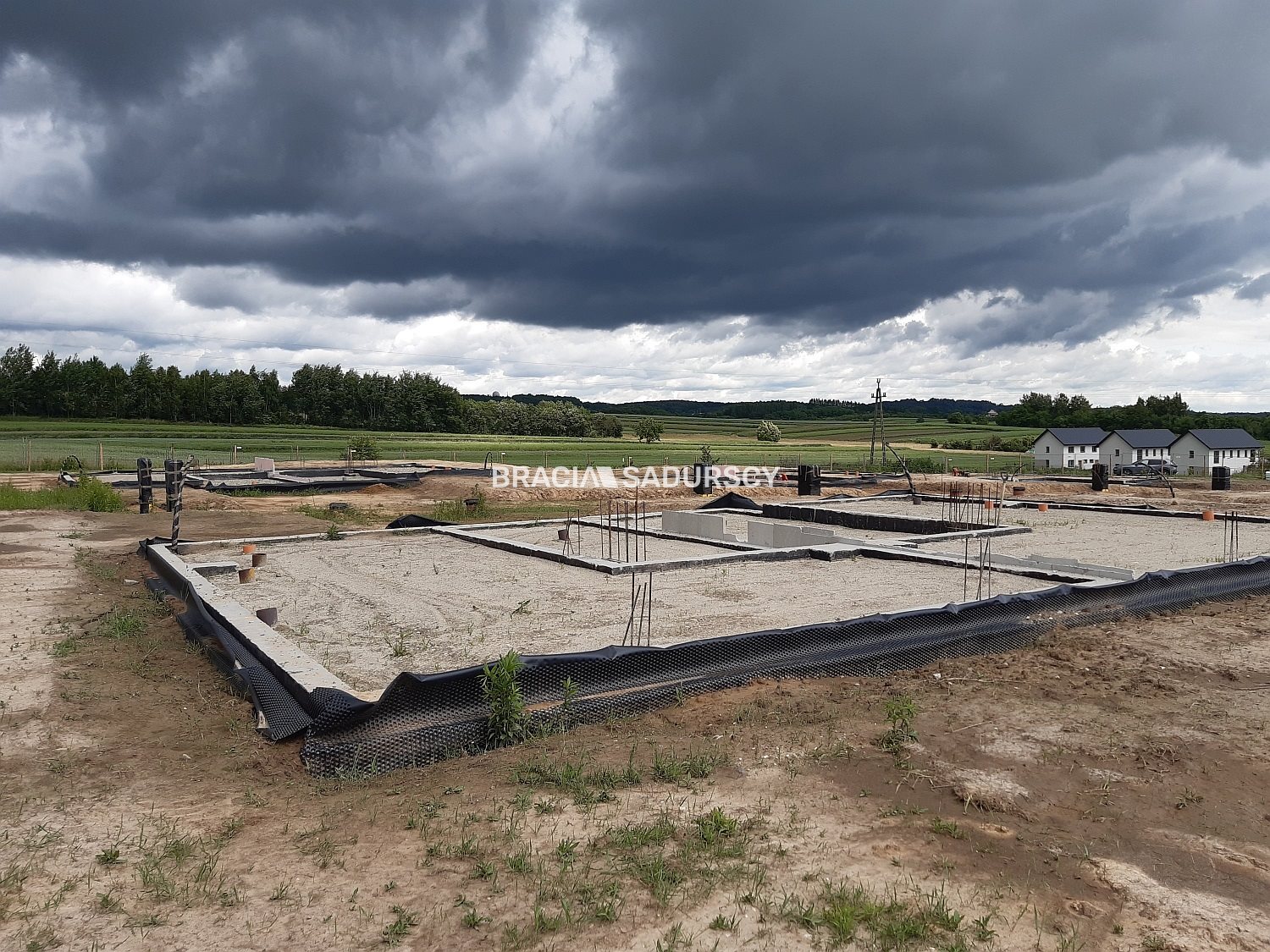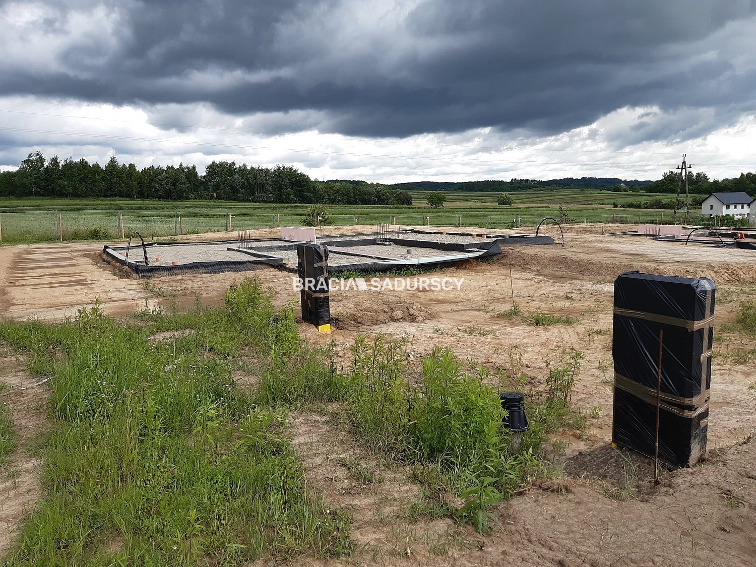 Działka z wylanymi fundamentami uzbrojona z rozprowadzoną siecią pod każdy dom (wodno-kanalizacyjną, prąd, gaz, światłowód).