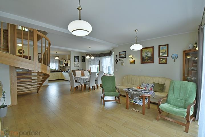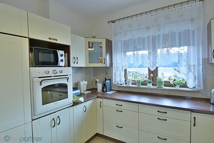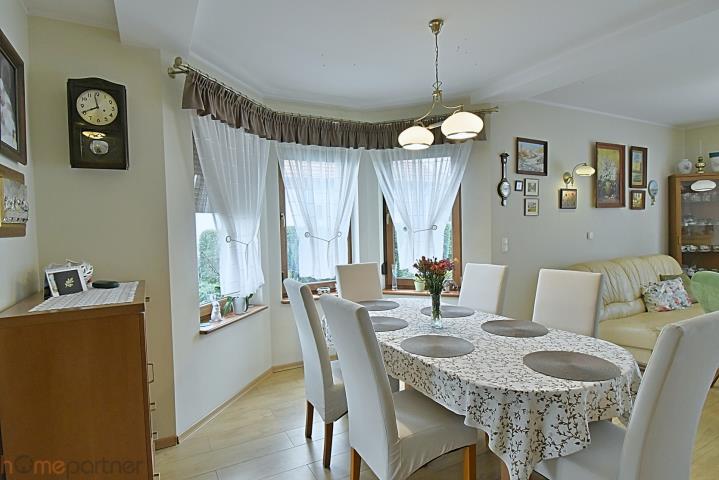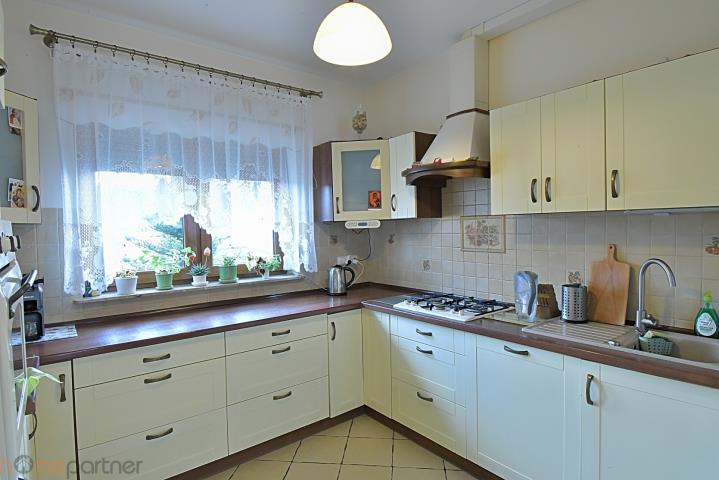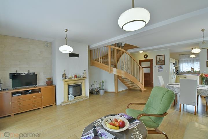 Dom posiada część dzienną złożoną z salonu z kominkiem z płaszczem wodnym, otwartego na jadalnię i kuchnię, z wyjściem na taras o południowo-zachodniej ekspozycji. Kuchnia w pełni wyposażona - lodówka, piekarnik. zmywarka 60 cm, płyta gazowa. Na dole wc oraz pomieszczenie gospodarcze z piecem gazowym jednofunkcyjnym z zasobnikiem.