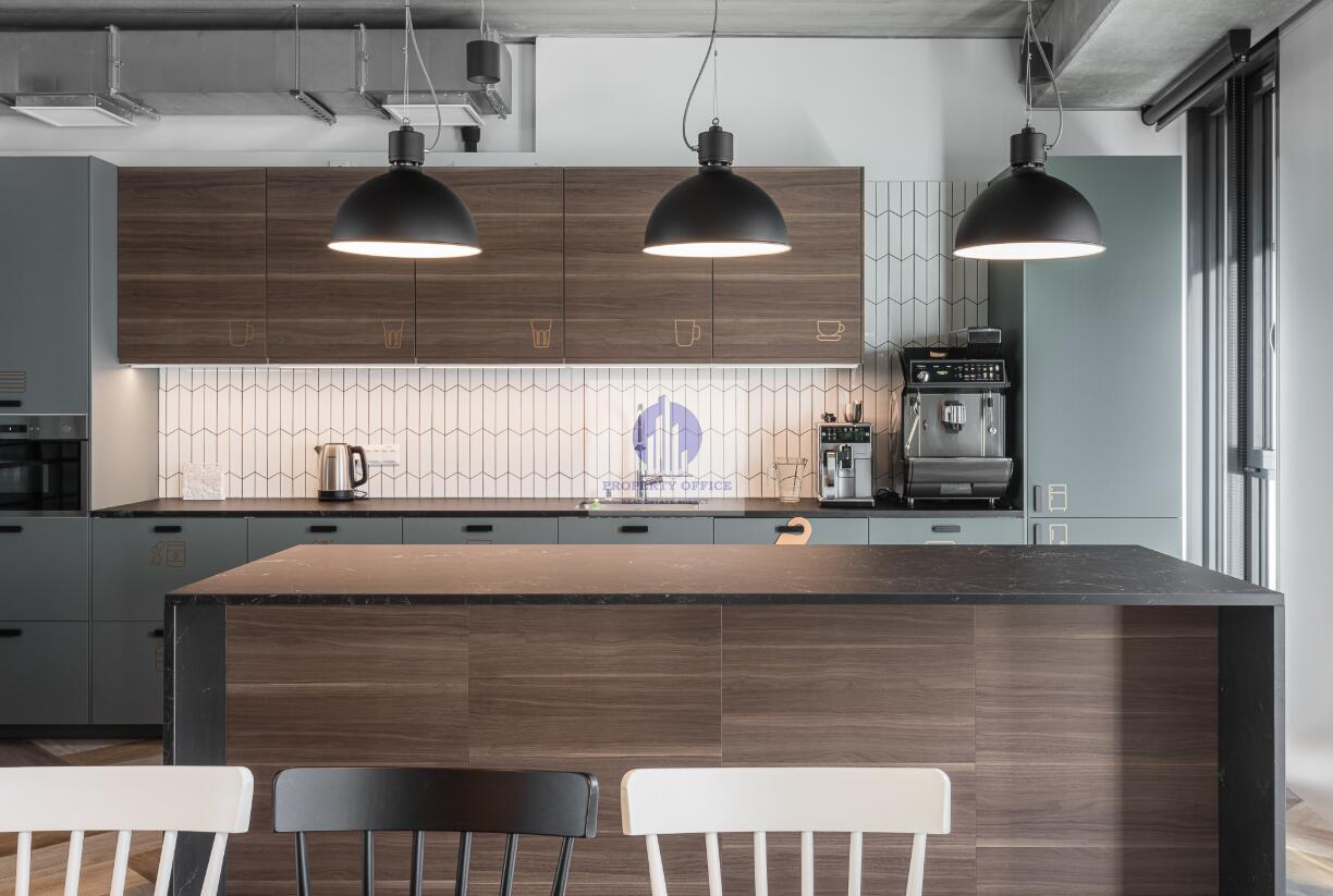 Podwieszany sufit w korytarzach, belki chłodzące, oświetlenie w części biurowej, uchylne okna, drzwi wejściowe, grzejniki, podniesiona podłoga, wyposażenie toalet, kontrola dostępu, 24h ochrona, BMS.