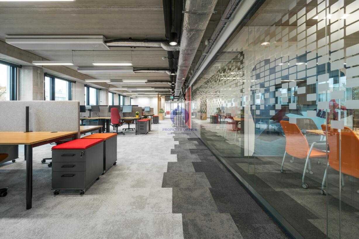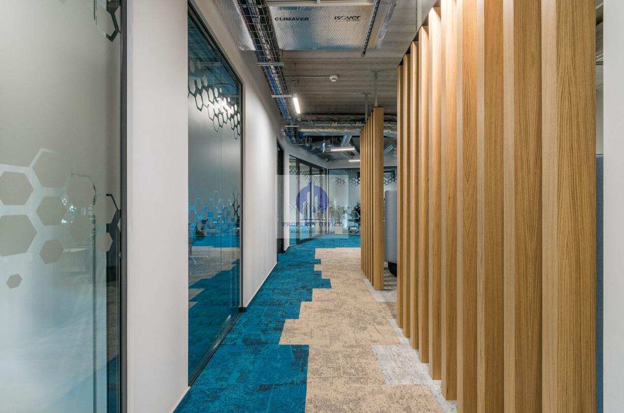Podwieszany sufit w korytarzach, belki chłodzące, oświetlenie w części biurowej, uchylne okna, drzwi wejściowe, grzejniki, podniesiona podłoga, wyposażenie toalet, kontrola dostępu, 24h ochrona, BMS.