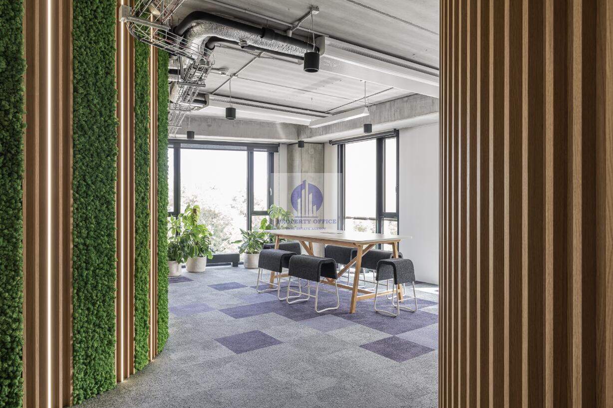 Podwieszany sufit w korytarzach, belki chłodzące, oświetlenie w części biurowej, uchylne okna, drzwi wejściowe, grzejniki, podniesiona podłoga, wyposażenie toalet, kontrola dostępu, 24h ochrona, BMS.