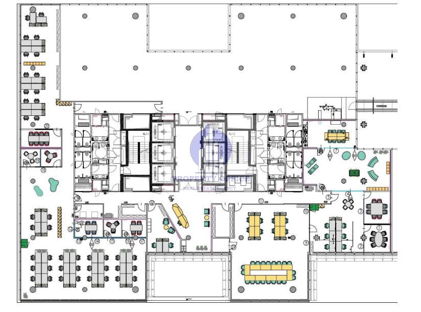 Aranżacja w układzie mieszanym z przewagą open space'u, salek konferencyjnych oraz przestrzeni kreatywnych.