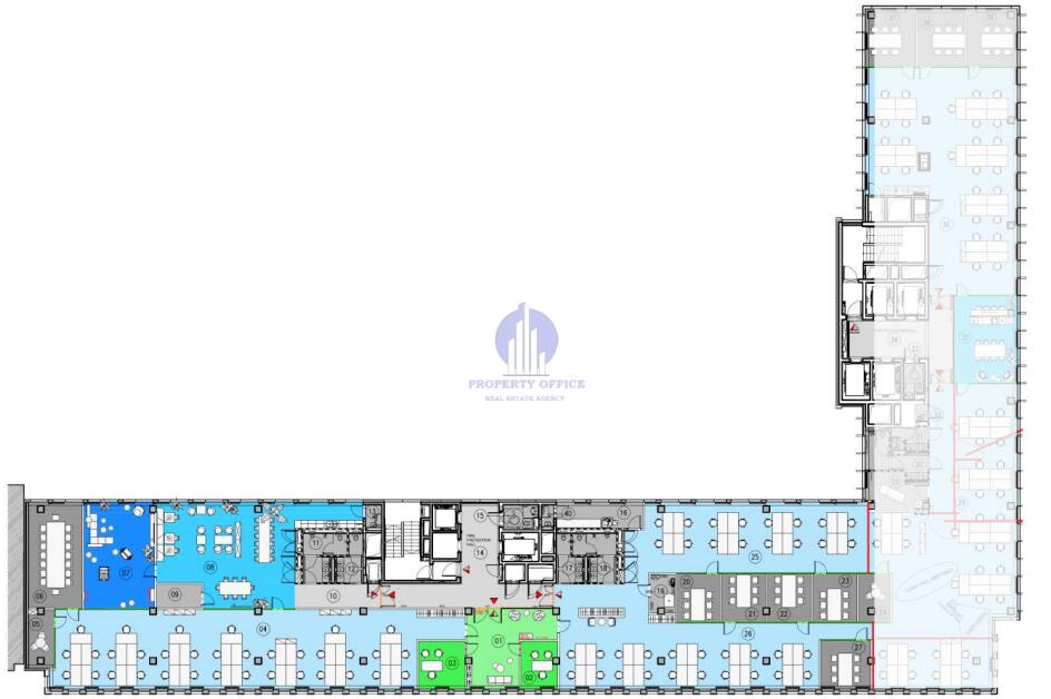 Powierzchnia w podziale mieszanym: open space, gabinety biurowe,sale konferencyjne, salki spotkań, pomieszczenia socjlane i pomocnicze.