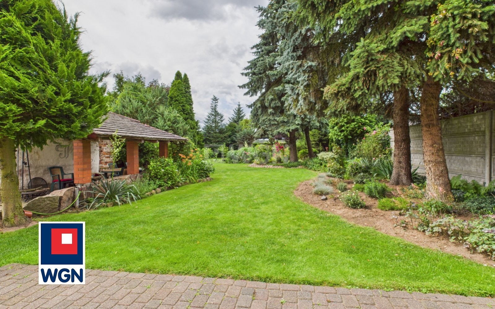 Teren wokół domu zagospodarowany, na działce znajduje się duży budynek gospodarczy oraz garaż.