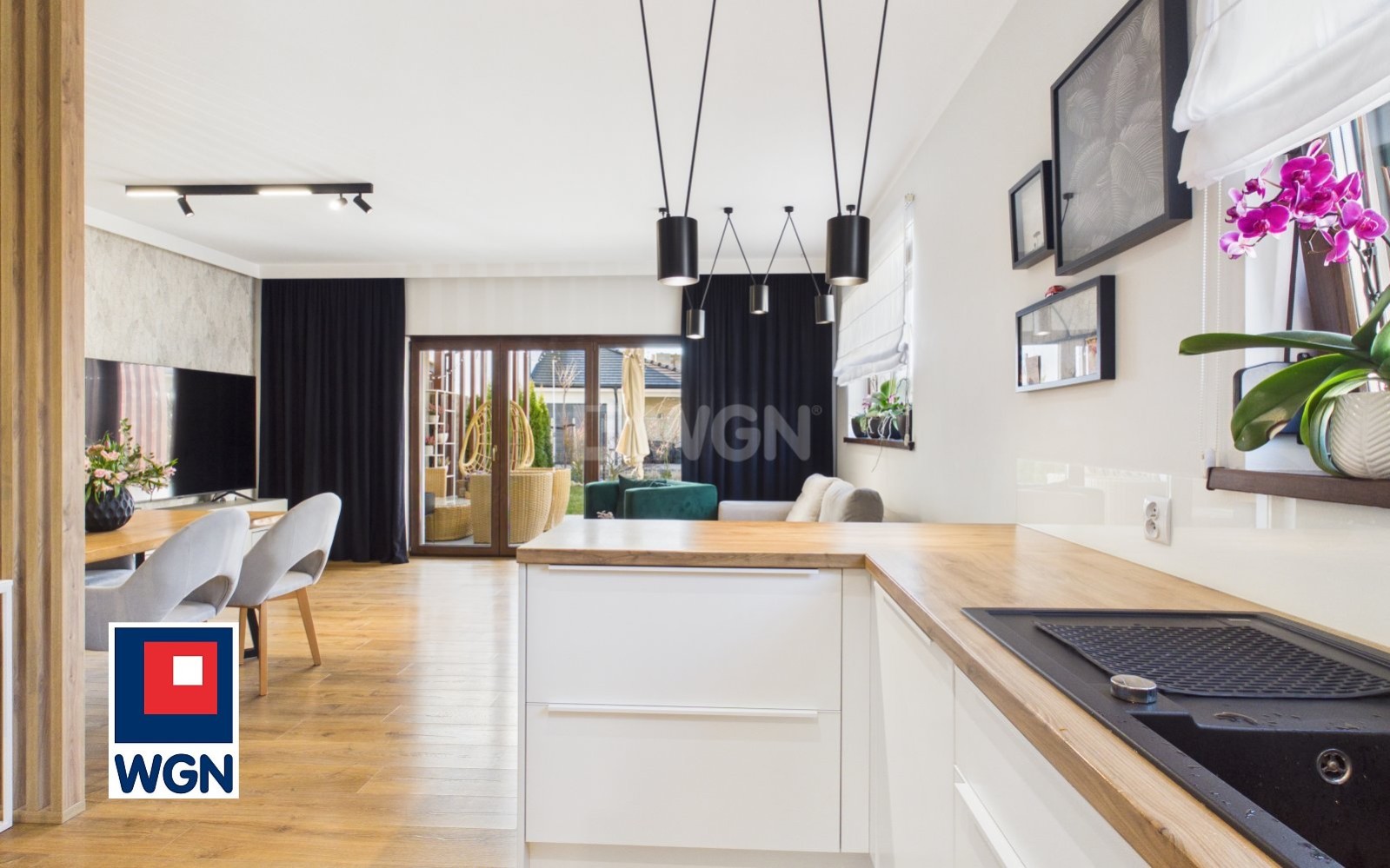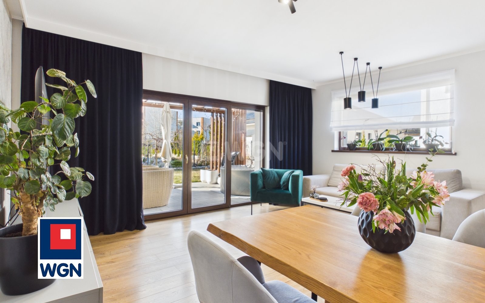 Największą siłą tej nieruchomości jest ponad 39-metrowa strefa dzienna - salon z kuchnią i jadalnią, który naturalnie łączy się z ogrodem.