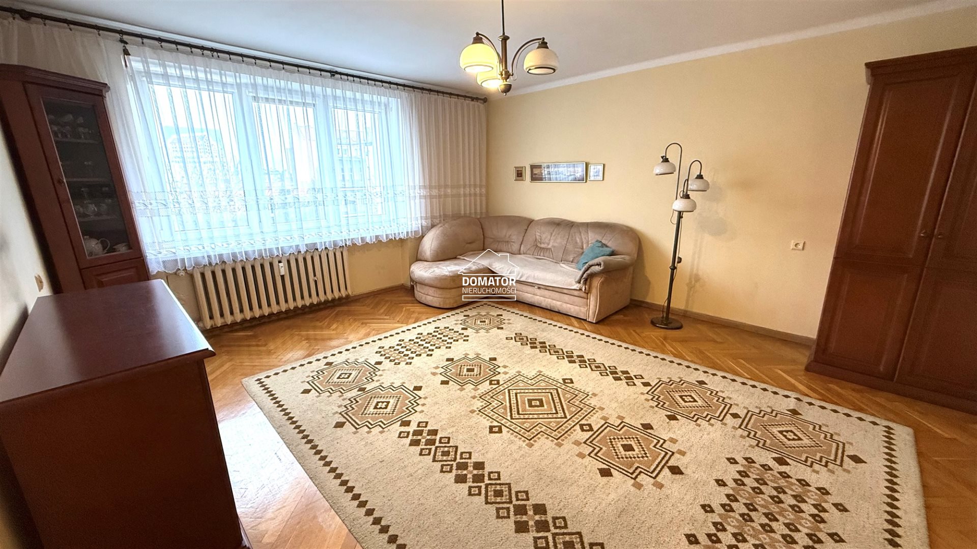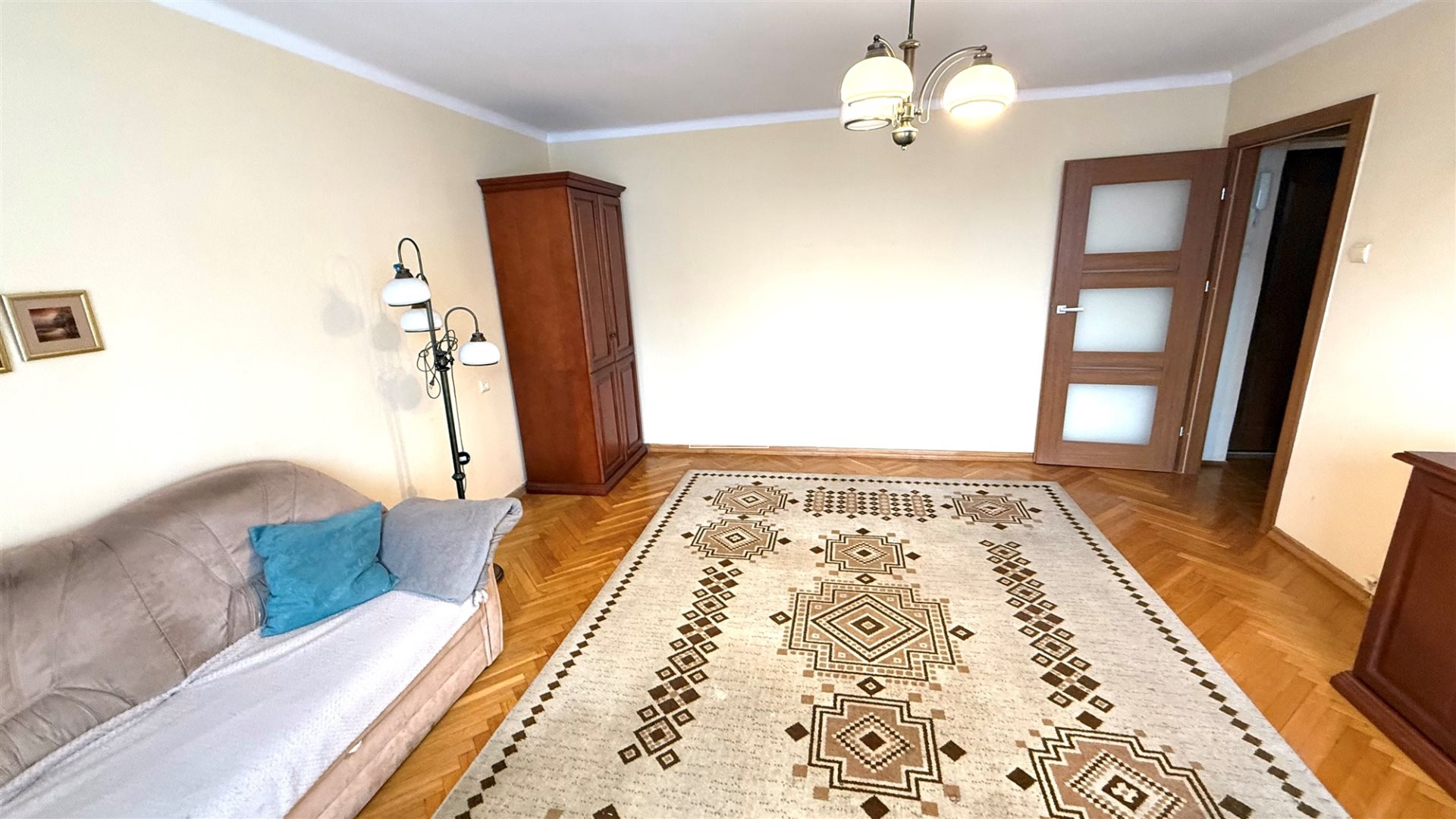 Lokal składa się z dwóch pokoi z aneksem kuchennym. Jasny salon wyposażony jest w wygodną sofę narożną oraz meble w klasycznym stylu. Duże okna zapewniają dobre doświetlenie wnętrza, a drewniana podłoga dodaje ciepła i przytulnego charakteru. Z salonu przechodzimy do funkcjonalnego aneksu kuchennego, który został wyposażony w niezbędne sprzęty AGD - kuchenkę gazową z piekarnikiem, zlewozmywak, liczne szafki do przechowywania oraz blat roboczy.