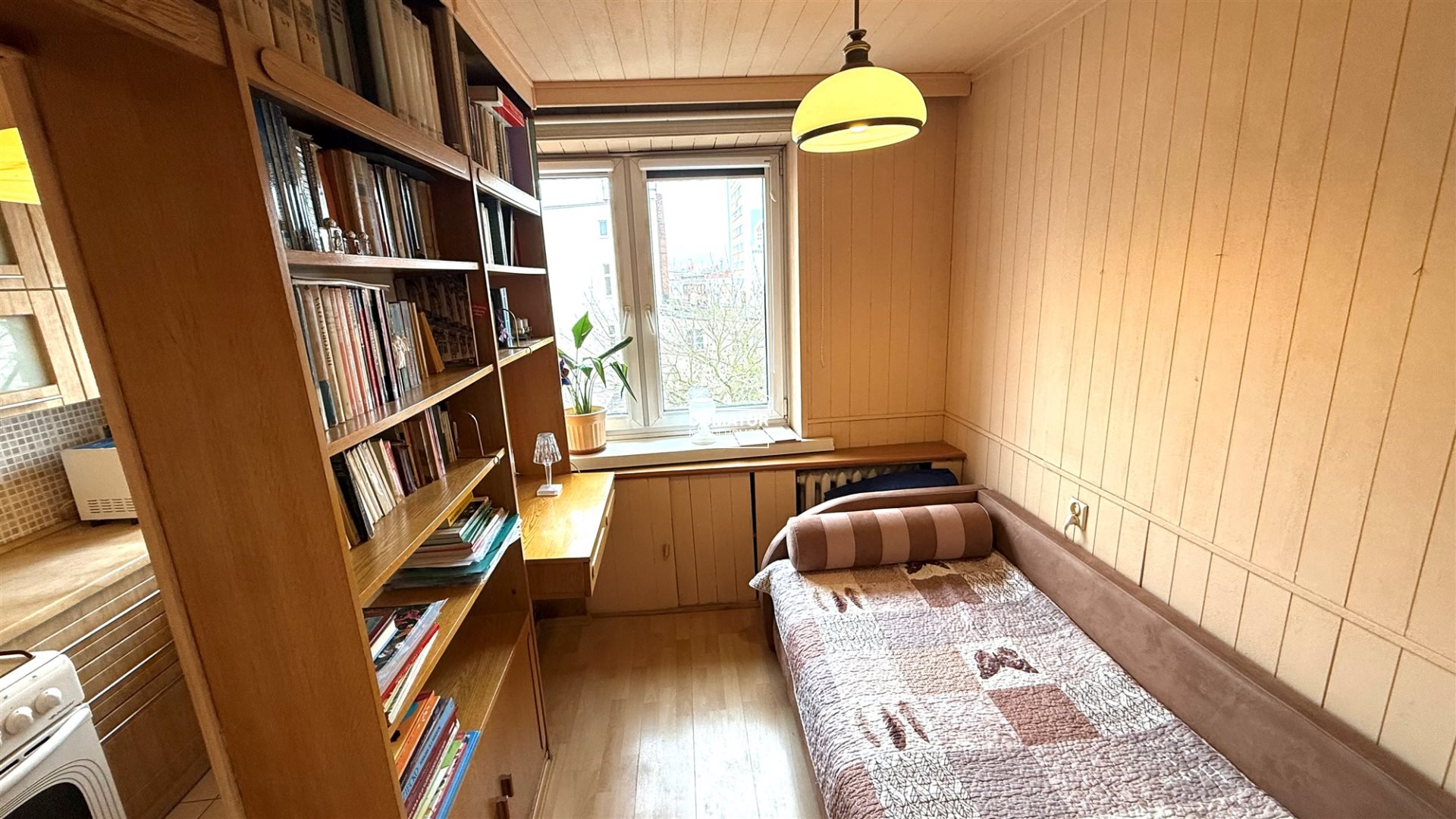 Drugi pokój może pełnić funkcję sypialni lub gabinetu. Znajduje się tu łóżko jednoosobowe oraz zabudowa z półkami na książki i miejsce do pracy, co czyni przestrzeń idealną zarówno do odpoczynku, jak i do nauki czy pracy zdalnej.