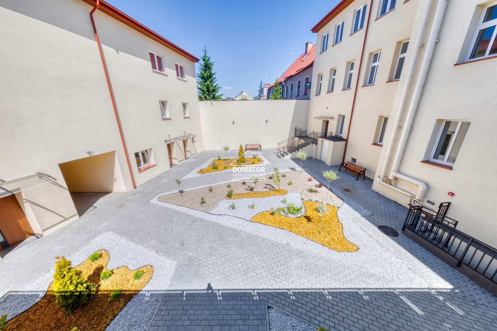 Zagospodarowane podwórze z trawnikami, nasadzeniami, strefą relaksu z ławkami oraz piaskownicą