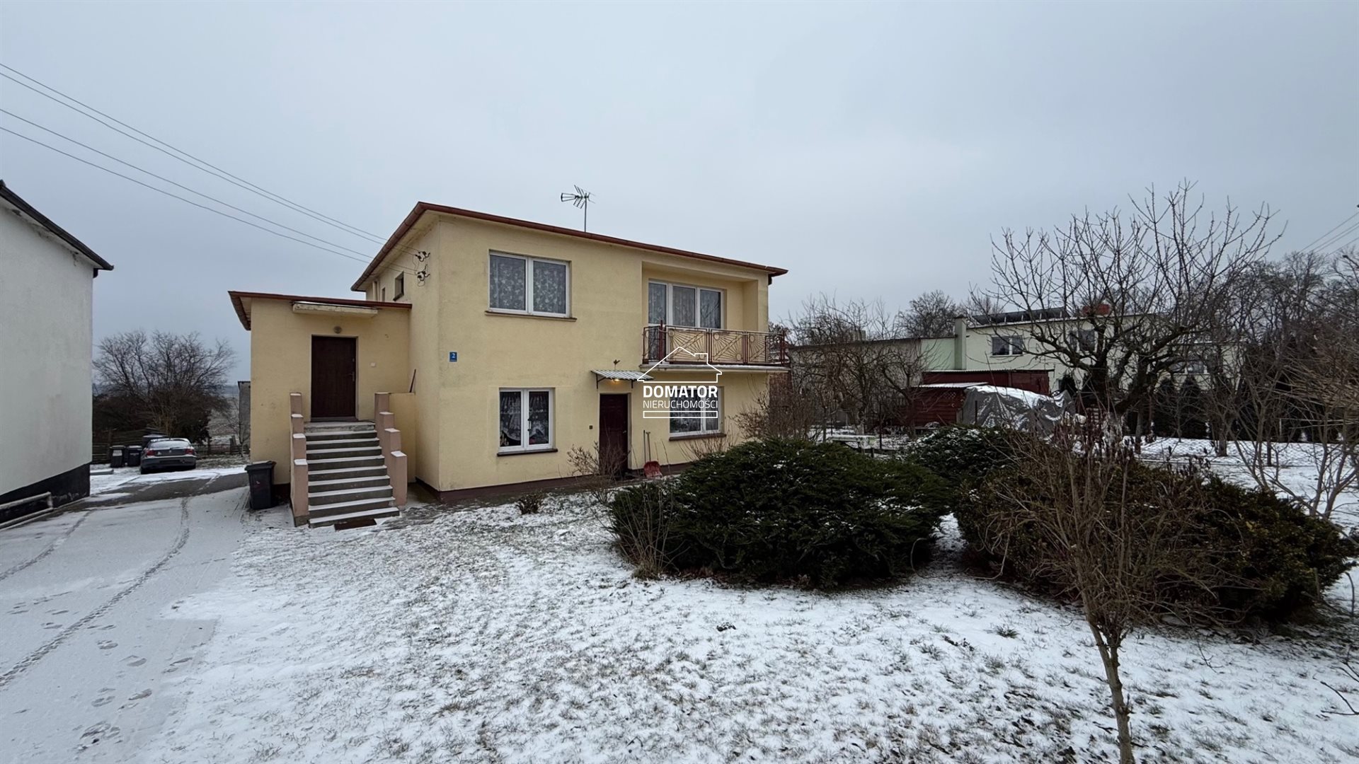 Dom dwukondygnacyjny, posiadający dwa niezależne wejścia do dwóch mieszkań, jednak połączonych ze sobą. Na parterze znajduje się przestronny salon, pokój, kuchnia, łazienka oraz kotłownia i pomieszczenie gospodarcze. Na piętrze usytuowane są trzy pokoje, przedpokój, łazienka z prysznicem oraz duży balkon. Okna PCV. Budynek ocieplony. Strop betonowy, dach płaski pokryty papą termozgrzewalną. Na działce znajduje się pomieszczenie gospodarcze o pow. 50 m2. Dom ogrzewany piecem z podajnikiem na ekogroszek. Działka częściowo zagospodarowana.