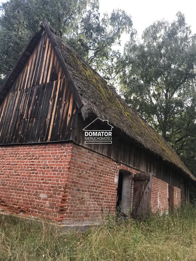 Na działce znajduje się rozpoczęta budowa domu, budynek z czerwonej cegły oraz drewutnia.