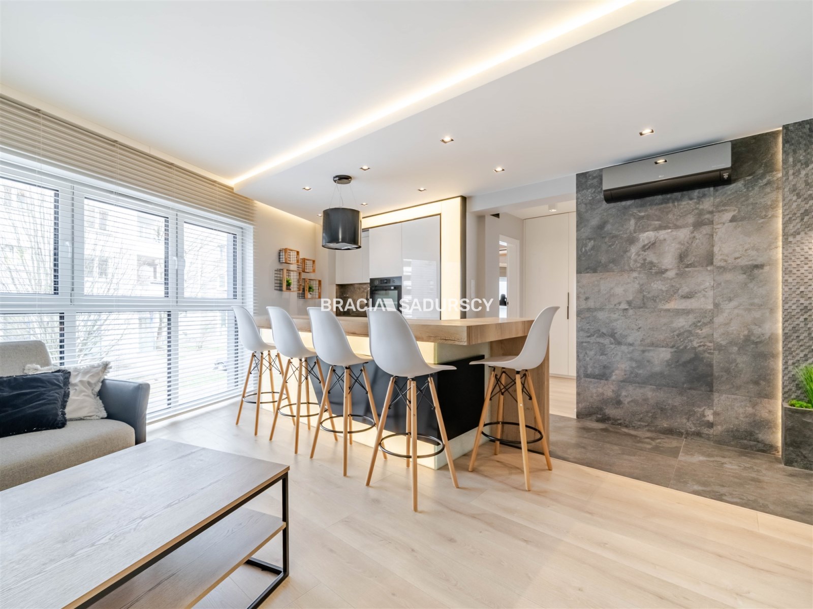 Wnętrze zachwyca otwartą przestrzenią: salon z aneksem kuchennym, w którym centralnym punktem jest stylowa wyspa kuchenna - doskonała do gotowania i spotkań z bliskimi. Dwie komfortowe sypialnie zapewniają prywatność i relaks, a klimatyzacja gwarantuje przyjemny klimat przez cały rok. Kuchnia jest wyposażona w płytę indukcyjną , nowoczesny telewizor oraz kompletny zestaw sprzętu AGD (m.in. pralka, suszarka) - wszystko, co potrzebne do codziennego korzystania. Salon z telewizorem jest idealna nie tylko do relaksu, ale i do pracy z domu.