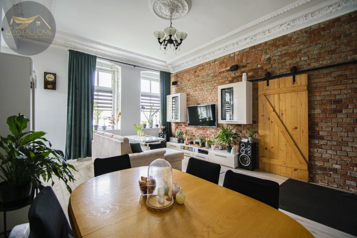To, co wyróżnia tę nieruchomość, to niepowtarzalny klimat wnętrza. Odsłonięta, oryginalna cegła oraz dekoracyjne sztukaterie nadają przestrzeni elegancji i wyjątkowego charakteru.