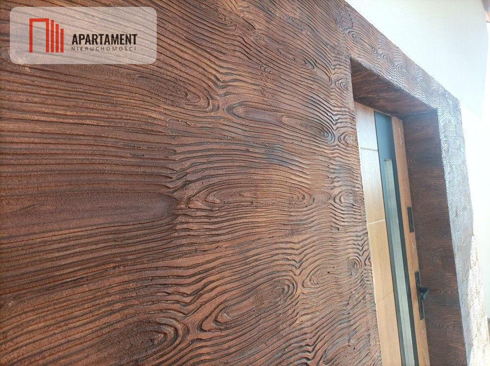 Całość wybudowana z materiału typu suporex, bardzo dobrze ocieplony (styropian 20cm), dachówka ceramiczna w bardzo gustownym kolorze Antracyt, elementy ozdobne z płyty na wzór drewna, brama garażowa automatyczna, rynny, zamontowane okna 3-szybowe, drzwi wejściowe wysokiej klasy.