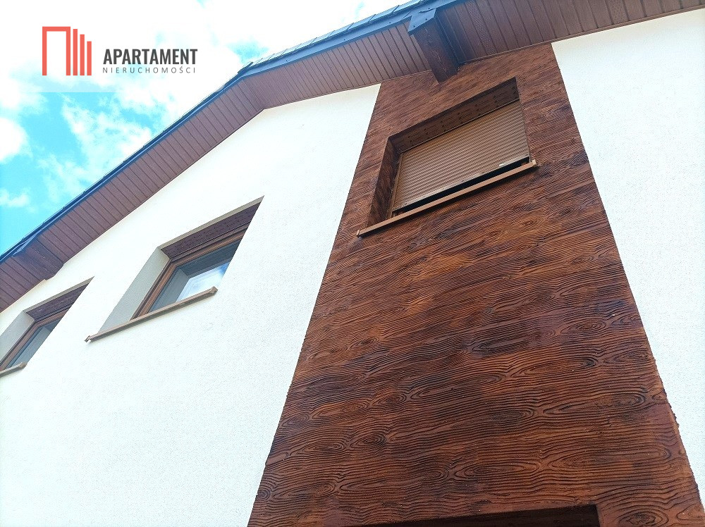 Całość wybudowana z materiału typu suporex, bardzo dobrze ocieplony (styropian 20cm), dachówka ceramiczna w bardzo gustownym kolorze Antracyt, elementy ozdobne z płyty na wzór drewna, brama garażowa automatyczna, rynny, zamontowane okna 3-szybowe, drzwi wejściowe wysokiej klasy.