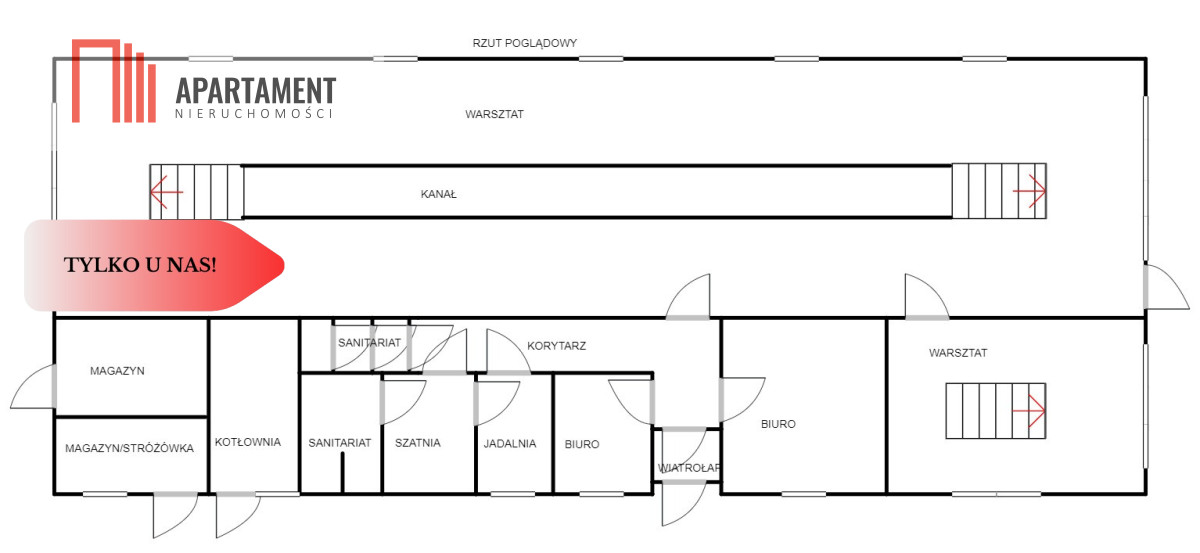 Duża przejazdowa wielkości 204mkw, o wymiarach 29mx7mx6m, z dwoma bramami 4mx4.50 dostosowana pod auta ciężarowe z kanałem