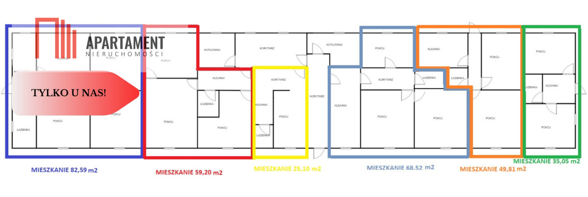- 3 pokoje, kuchnia, łazienka, korytarz o łącznej powierzchni 59,20 m2