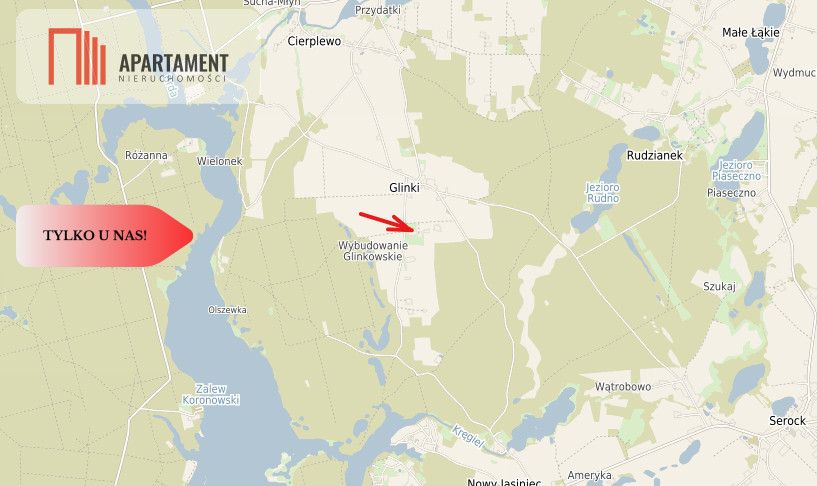 Nieruchomość usytuowana jest około 400 m od linii lasu, 2 km od Zalewu Koronowskiego, 2 km od Jeziora Rudno.
